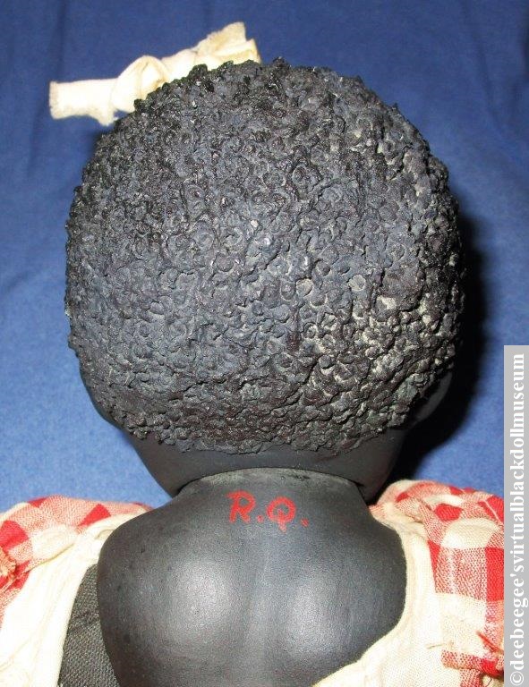 Other: Little is known about doll artist, Rubin Quintano, who made one-of-a-kind dolls during the 1990s in the fashion of late 19th-century doll maker Leo Moss. Quintano’s dolls possibly date back to the 1970s or 1980s, but 1990s examples have been documented. His dolls are notable for their tightly coiled sculpted hair, down-turned mouths, big brown eyes, and sometimes tears. They can often be mistaken in pictures for authentic Leo Moss dolls. The smooth texture of his dolls’ faces and extremities is a major difference between Quintano’s Moss-type dolls and authentic Leo Moss dolls. Quintano’s dolls usually bear his initials and/or numbers that precede and follow the initials.