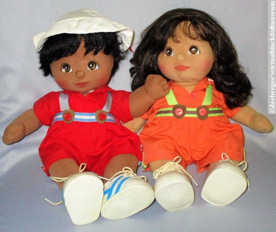 Clothes: Dressed in an identical style of My Child clothing, the boy wears a red shirt and red shorts with blue cloth suspenders and blue and white grosgrain trim at the waist. He wears a white hat and replaced shoes. The girl’s shirt and shorts are orange with green and brown grosgrain trim at the waist and green cloth suspenders. White panties are worn underneath and white Cabbage Patch doll shoes cover the girl’s feet. The dolls originally wore Pampers diapers.