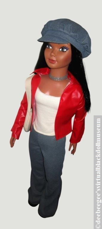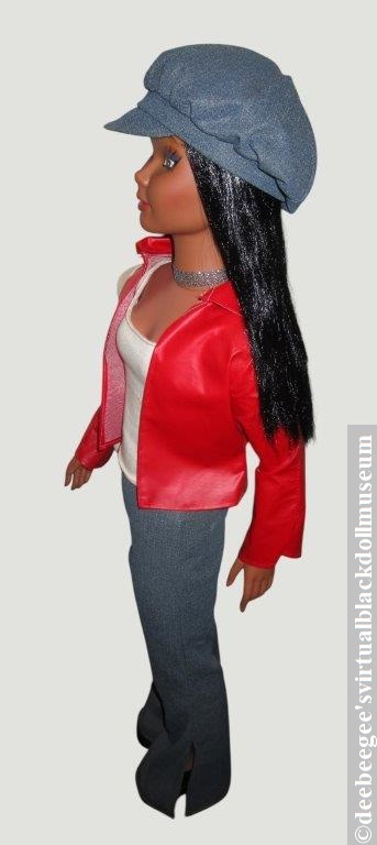 Clothes: White tank top, red vinyl jacket, blue denim bell-bottom jeans with side splits in the bell area, blue denim cap, silver choker necklace, white vinyl shoulder bag, black thick-soled shoes; an extra pink princess-style dress was included.
