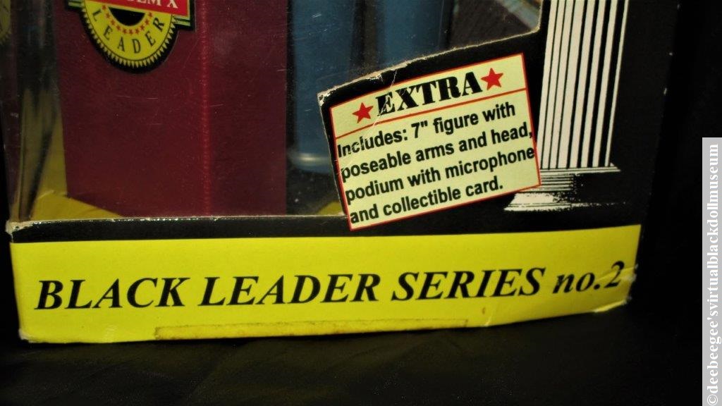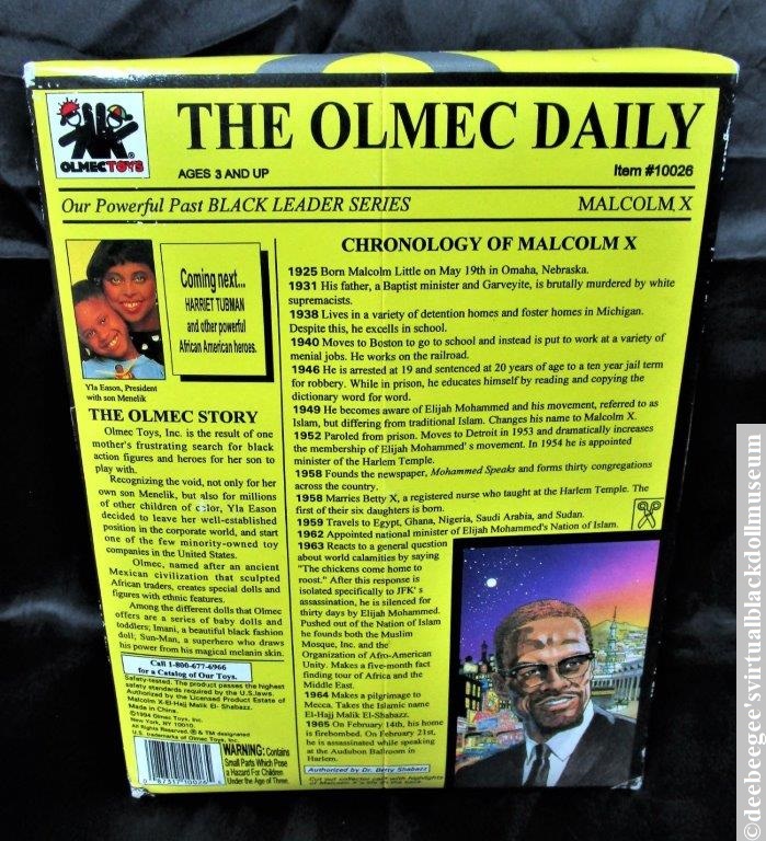Other: Item #10026, Malcolm X, is the second figure in Olmec’s Our Powerful Past series. The package includes the 7-inch figure with posable head and arms, a podium with a microphone, and a collectible card on the back of the box. The back of the box also includes a biography of Malcolm X. An image of Malcolm X serves as the backdrop of the inside box panel.