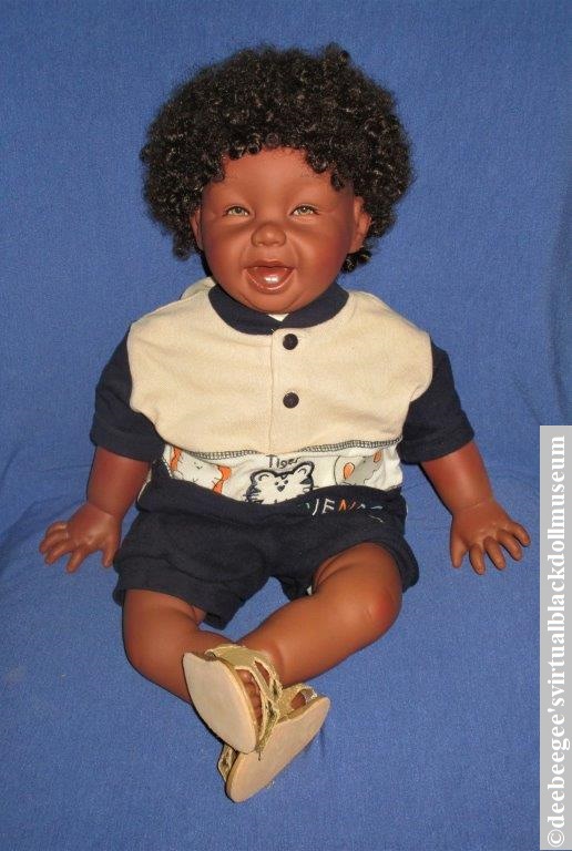 Jordan is 20 inches tall, has a baby body, and has curled-under fingers. This doll has a dark-brown curly wig, brown eyes with applied upper eyelashes, and an open/closed mouth. The head is marked JORDAN / ©2001 PAT SECRIST.