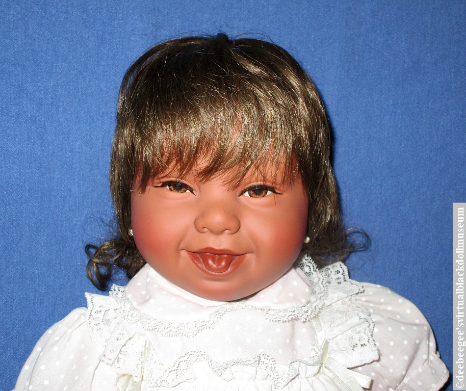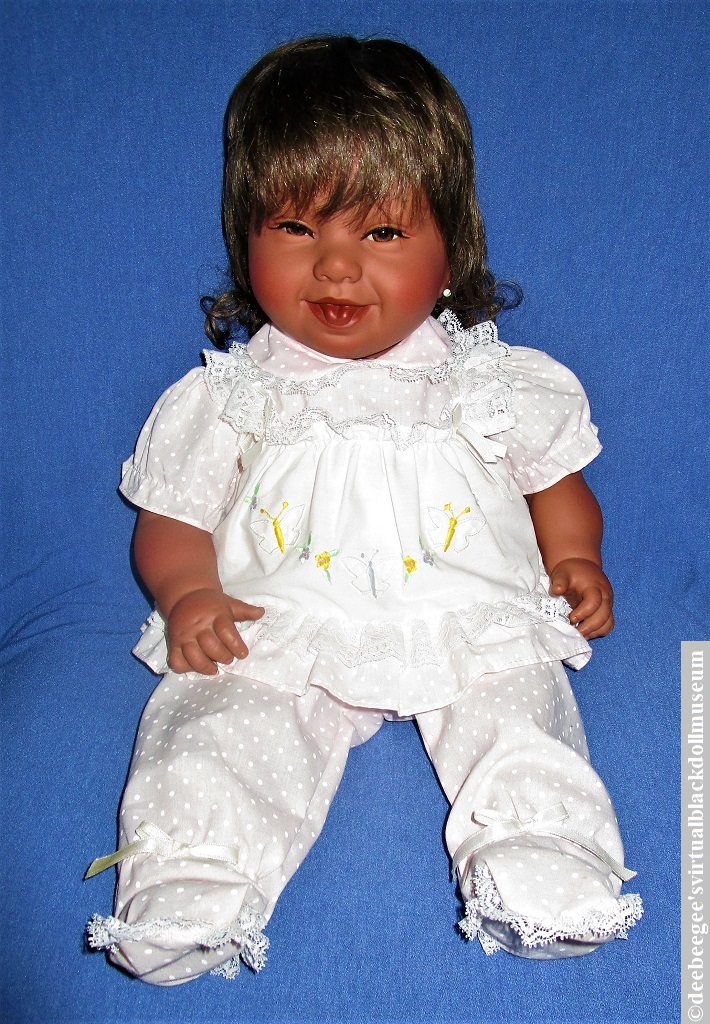 Jessie has the deepest complexion of the dolls in this installation and is on a non-Apple Valley pellet-filled dyed-brown cloth body with lower vinyl arms and legs for an overall height of 19 inches. Jessie was given the “reborn doll treatment” of rooted curly black hair, more realistic-looking dark-brown eyes with applied upper eyelashes, opened nostrils, facial blushing and lip color, blushing in the dorsal areas of the hands and feet and the soles of the feet, and pierced ears. Jessie also has a manicure and a pedicure. This doll has an open/closed mouth and a sculpted tongue. The head is marked “JESSIE” / ©1999 PAT SECRIST.