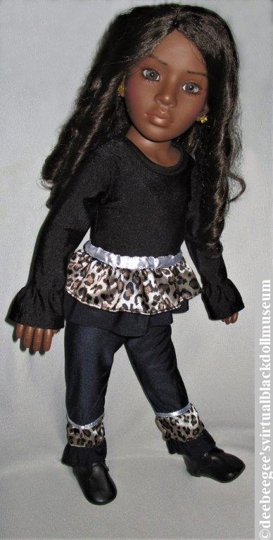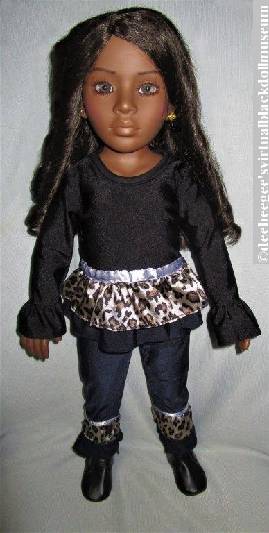 Clothes: The original clothes include a navy-blue top accented with an animal-print ruffle near the hem and a row of navy-blue fabric underneath. Animal print fabric trims the black pants. An animal print jacket and black Mary-Jane-style shoes, which are both missing, are also part of the original clothes. Wears a white Global Girl T-shirt and matching panties.