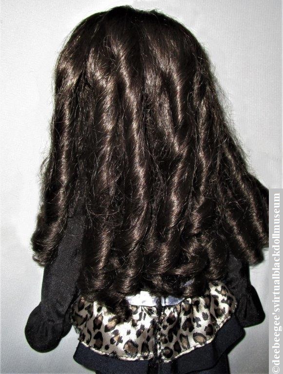 Hair, Eyes, Mouth: Dark-brown spiral-curled wig that extends below the waist, brown glass inset eyes with applied upper and lower eyelashes, closed mouth with nude lip color; has pierced ears