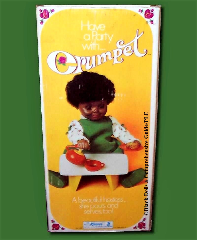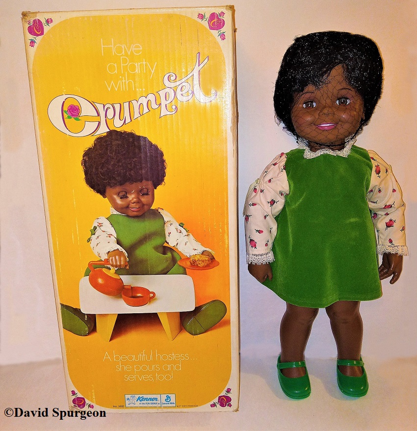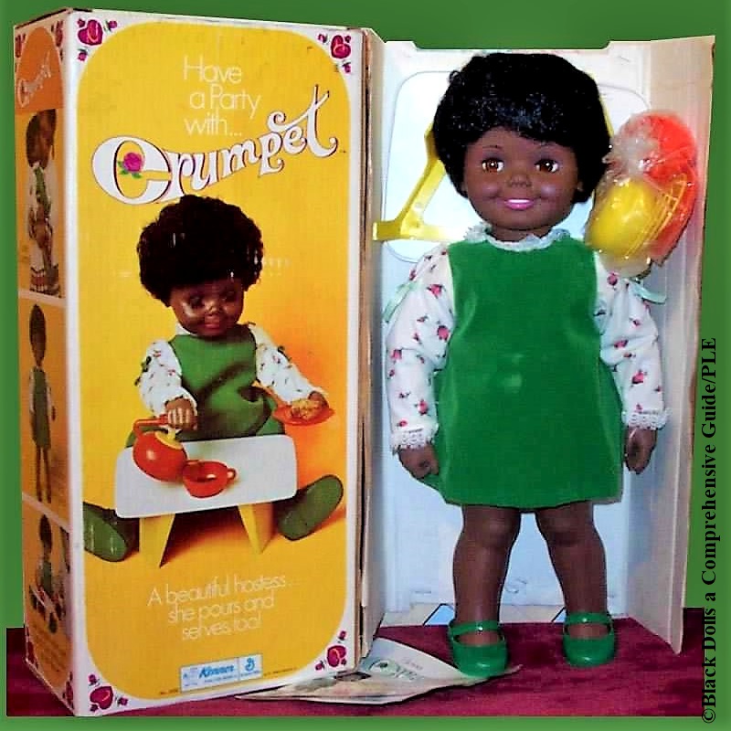 Other: Designed to serve tea, Crumpet is battery-operated and has a pull string that activates the doll’s movement. Accessories include a party table, teapot and lid, four cups and saucers, and a special cookie plate. Black versions are rare.