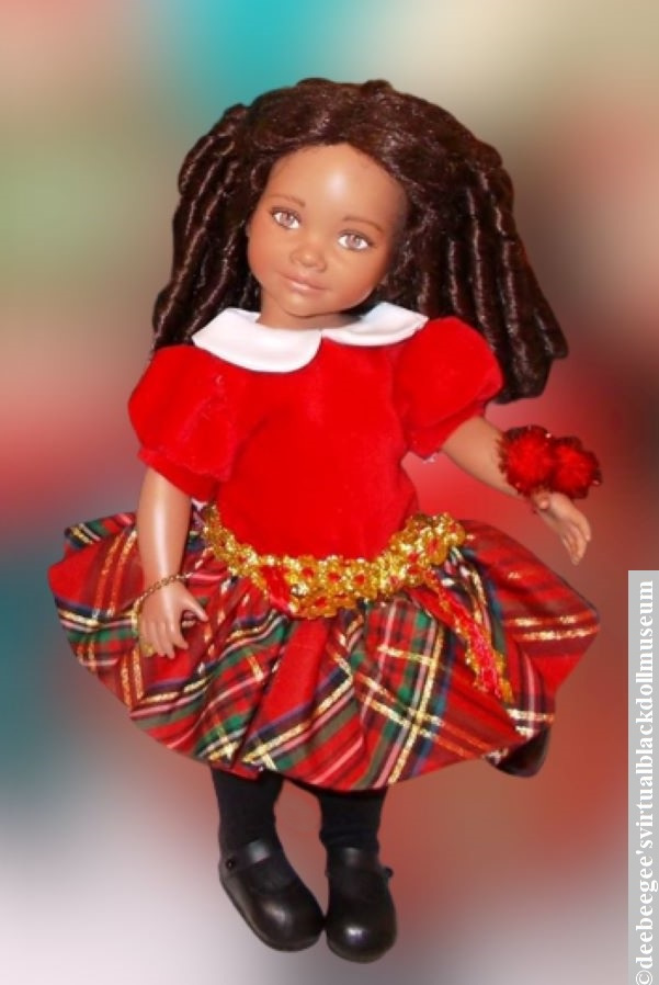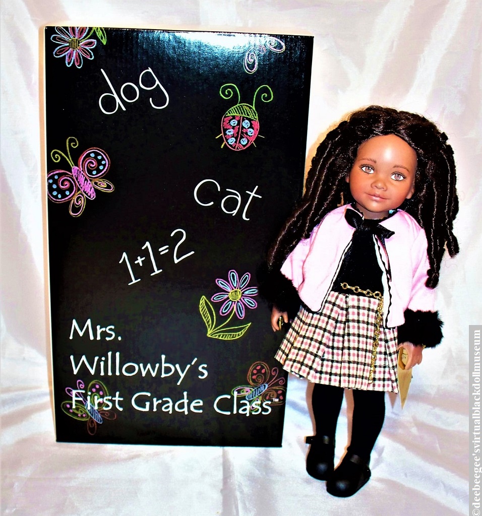 Other: In the mid-2000s, Robert Tonner/Tonner Doll Company acquired the Effanbee doll company and released a line of high-end play dolls. Mrs. Willowby’s First Grade Class series is from Tonner’s Effanbee play-doll line. Released in 2008, Libbie is the only Black doll in the series. In the gallery photos, Libbie wears two different separately-sold fashions. The Christmas Pretty 2006 fashion was released in a limited edition of 300, which included a pom-pom ponytail holder. Libbie wears this on the wrist. The Little Fashionista corduroy pants fashion was released in 2007 in a limited edition of 200.