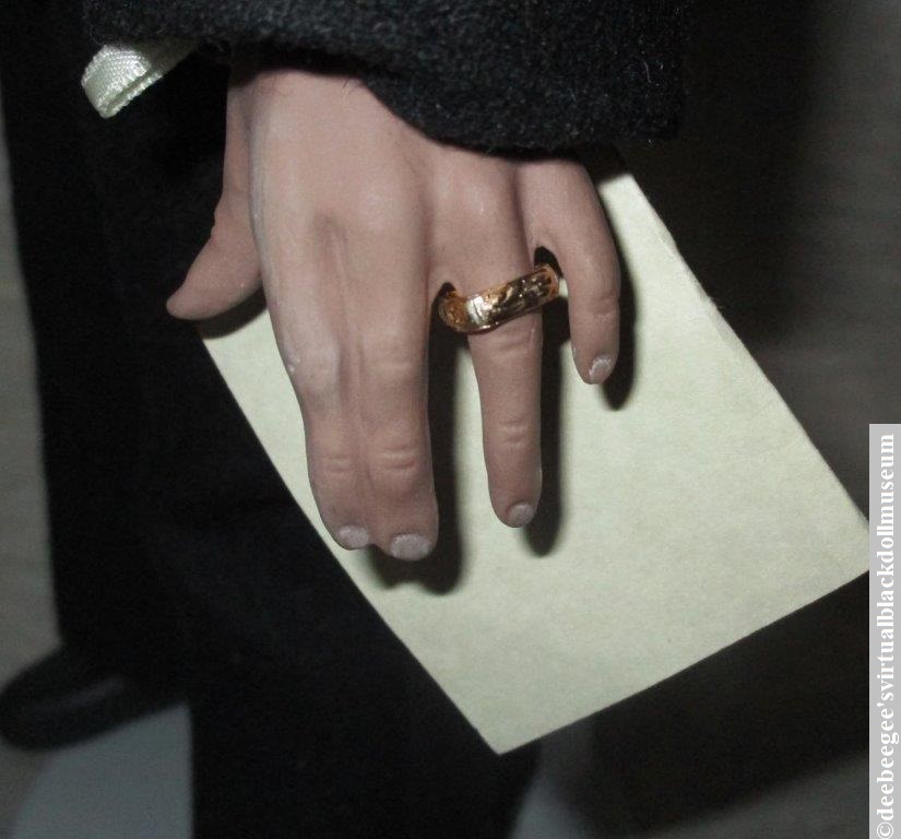 Hair, Eyes, Mouth: Has a handmade salt and pepper short curly wig, inset brown eyes with painted upper and lower eyelashes, a closed mouth with dark red lip color