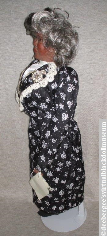 Clothes: Wears a black and white floral-print silk dress with a rhombus-shaped lace-trimmed collar with inserted white satin fabric, white satin slip, white taffeta pantalettes, and black panted-on low-heeled shoes. Jewelry includes a rhinestone and silver-tone brooch, a faux pearl necklace, a black beaded necklace, and faux pearl drop earrings. This doll is possibly missing a black straw church hat.