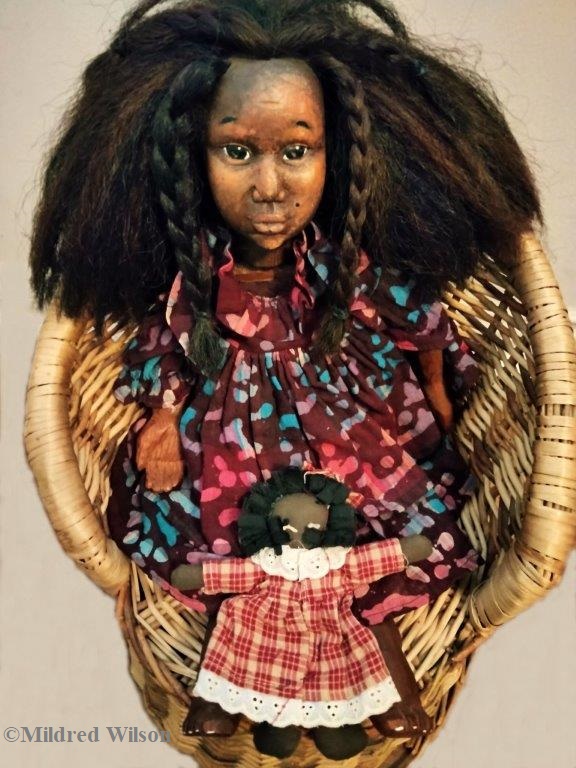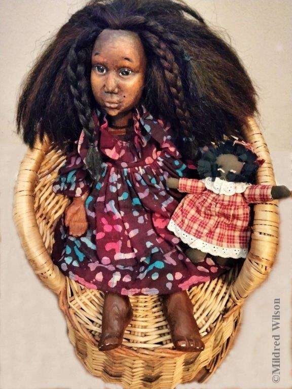 Purchased directly from the artist, “Savannah” appears to be the same doll featured on page 397 in Black Dolls Book II an Identification and Value Guide by Myla Perkins (Collector Books, 1995). The doll pictured in Perkins’ book was submitted to the author by the artist, Kor January before the doll was sold.
