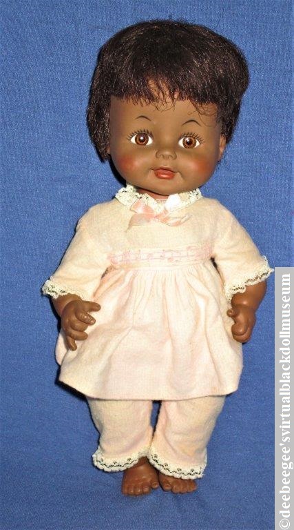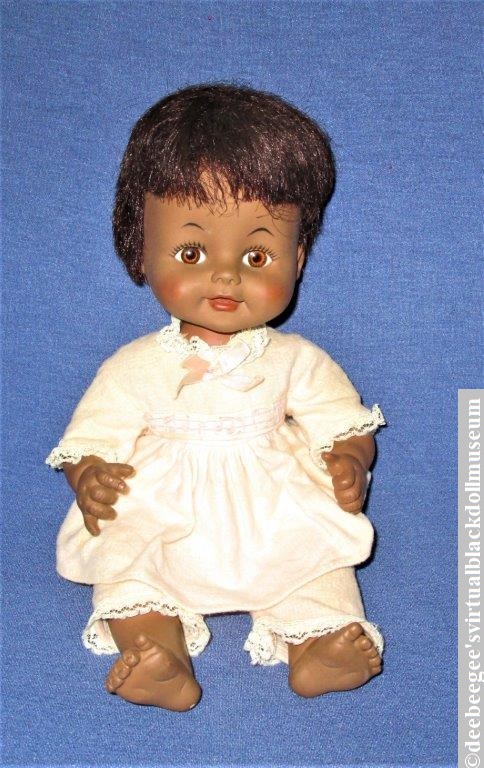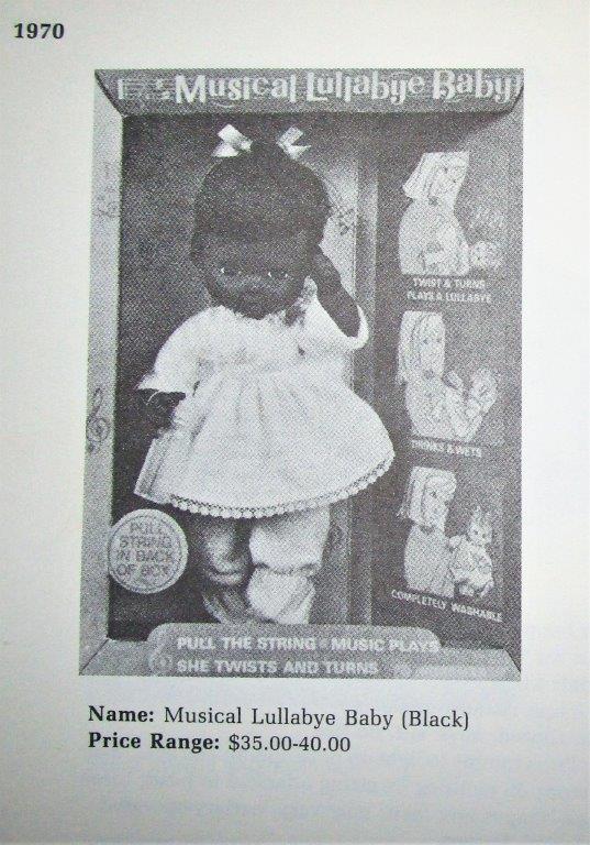 The original name for white versions of this doll that first appeared in the 1963 Horsman catalog was Lullabye Baby. “Musical” was added to the name in the 1969 catalog when the black version is first mentioned (without a picture) in the pictured white doll’s details. A picture of the black doll is included in Horsman’s 1970 catalog, which is included in the gallery photos.