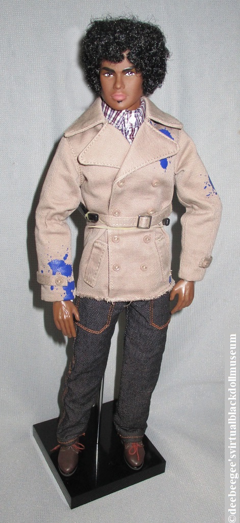 Clothes: Wears a brown/blue/white plaid shirt, tan double-breasted safari jacket with blue paint splattered on the sleeves and front, denim jeans, brown oxfords; has black doll stand.