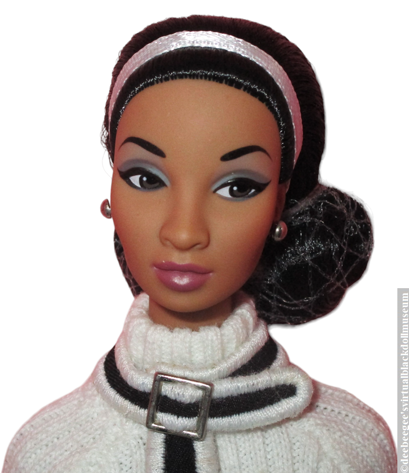 Hair, Eyes, Mouth: Black rooted, shoulder-length curled-under bob adorned with a white ribbon headband; brown-painted side-glancing eyes, closed mouth with mauve lip color.