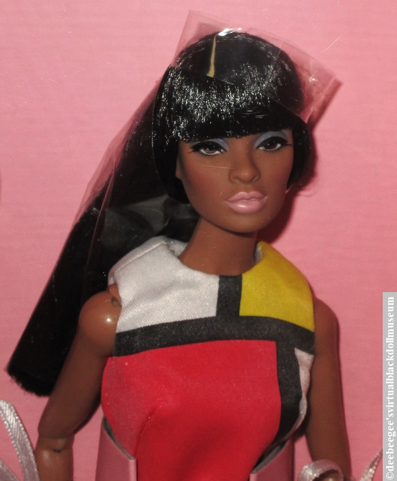 Clothes: Wears a Mondrian-style Mod dress with bold white, red, blue, and yellow blocks outlined in black. Accessories include a blue felt hat, a black-and-white handbag, white shoes outlined in black, yellow stud earrings, blue and red bracelets, and nude pantyhose. Accessories include a blue and a red bangle bracelet and a doll stand.