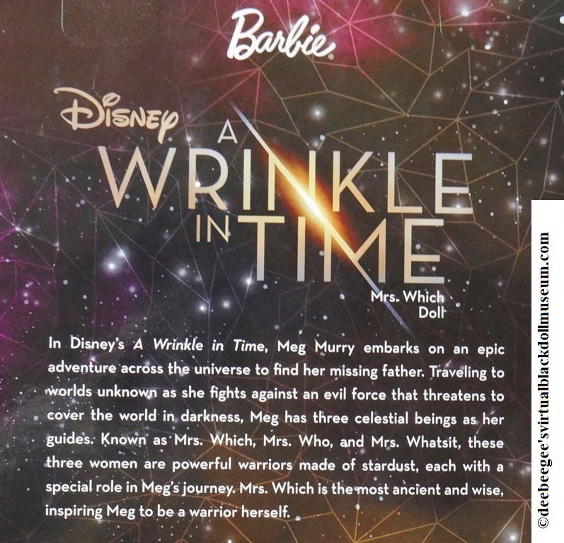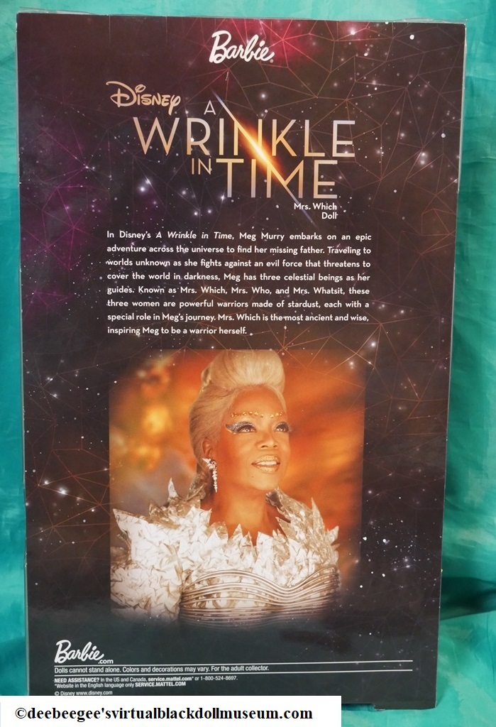 Other: American talk show host, television producer, actress, author, and media mogul Oprah Winfrey portrayed the role of Mrs. Which, a celestial being, in the Disney movie A Wrinkle in Time, which premiered on March 9, 2018. Made of stardust (in the fantasy story), Mrs. Which is the most ancient and wise powerful warrior (of two other warriors) who influenced the main character, Meg, to be a warrior herself. Mattel’s portrait doll of this character bears a good likeness to Ms. Winfrey.