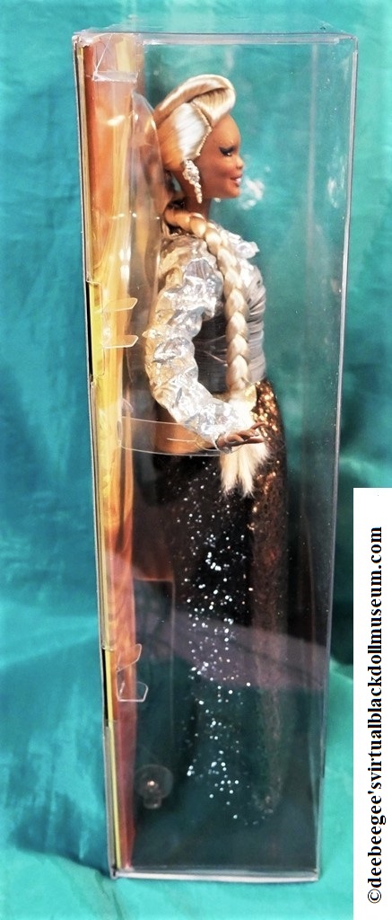 Clothes: Costumed in a silver lamé top with several silver cords wrapped around the bodice and a bronze lamé skirt; wears silver drop earrings and gold shoes; includes a doll stand and a certificate of authenticity.