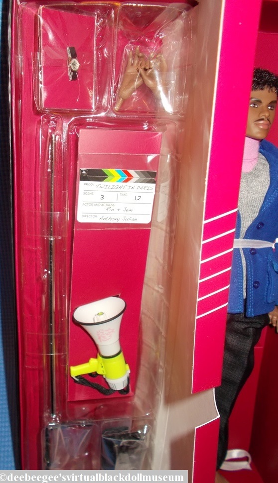 Integrity Toys Description: “Meet music video director Anthony Julian, friend and collaborator of JEM AND THE HOLOGRAMS! Anthony Julian is a fully articulated vinyl figure with sleek rooted curly and flocked hair. The man of the hour comes dressed in one of his key looks from the hit 80’s animated TV series. His elaborate layered outfit sends us that “oh so 80s” vibe with his turtleneck, V-neck knit sweater and plaid pants, topped by his signature royal blue driver coat, perfect for those late night takes out by the chilly banks of the Seine River in Paris. Of course, no film director would be complete without his stylish watch, bullhorn (plastic) and movie clap board (card board)… Cut! It’s a Wrap!…”
