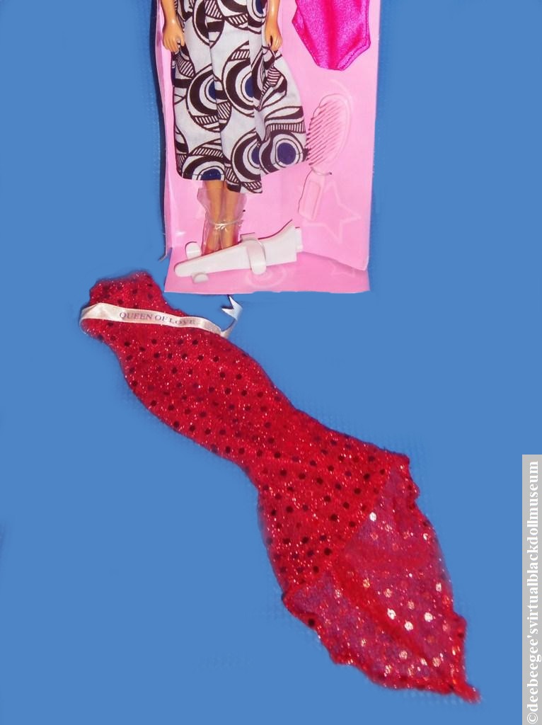 Custom Nneka wears a burnt orange lace top, a peach, brown, and tan wrap skirt; a gold headwrap, and white panties; has a red clutch and a pink swimsuit attached to the box liner, and a separately packaged shimmery red gown with a sash that reads: Queen of Love.