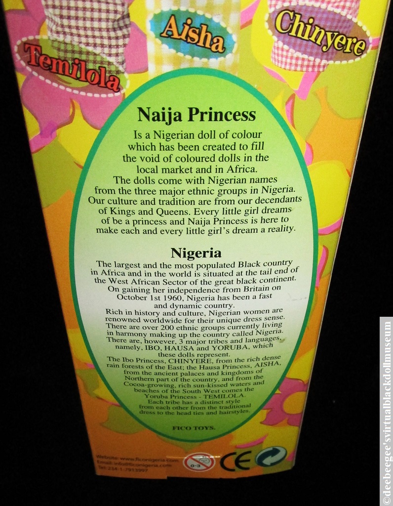 Other: Part of a line of 11-1/2 inch dolls created by Taofick Okoya, Naija (Nigerian) Princess dolls were “created to fill the void of black dolls in the local market and in Africa. The dolls come with Nigerian names from the three major ethnic groups in Nigeria. Our culture and tradition are from our [decendants] of Kings and Queens. Every little girl dreams of [be] a princess and Naija Princess is here to make each and every little girl’s dream a reality” (Text from the back of the box). The referenced tribes are Hausa, Ibo, and Yoruba. Aisha is a Hausa princess, Chinyere is an Ibo princess, and Temilola represents a Yoruba princess.