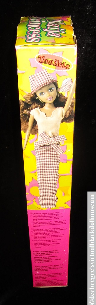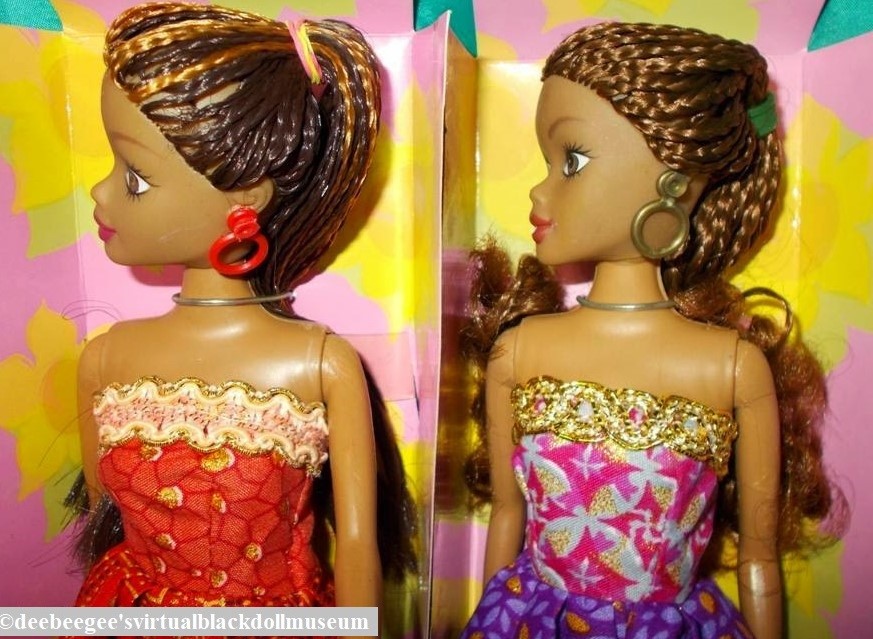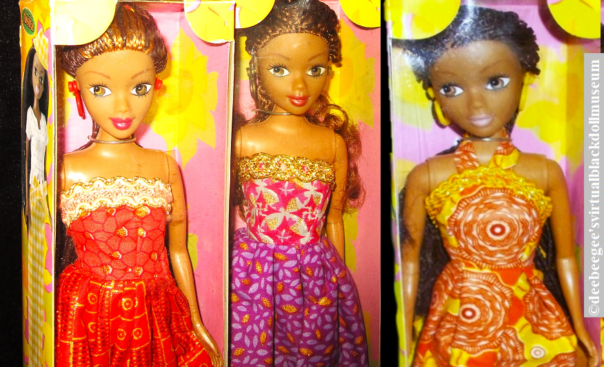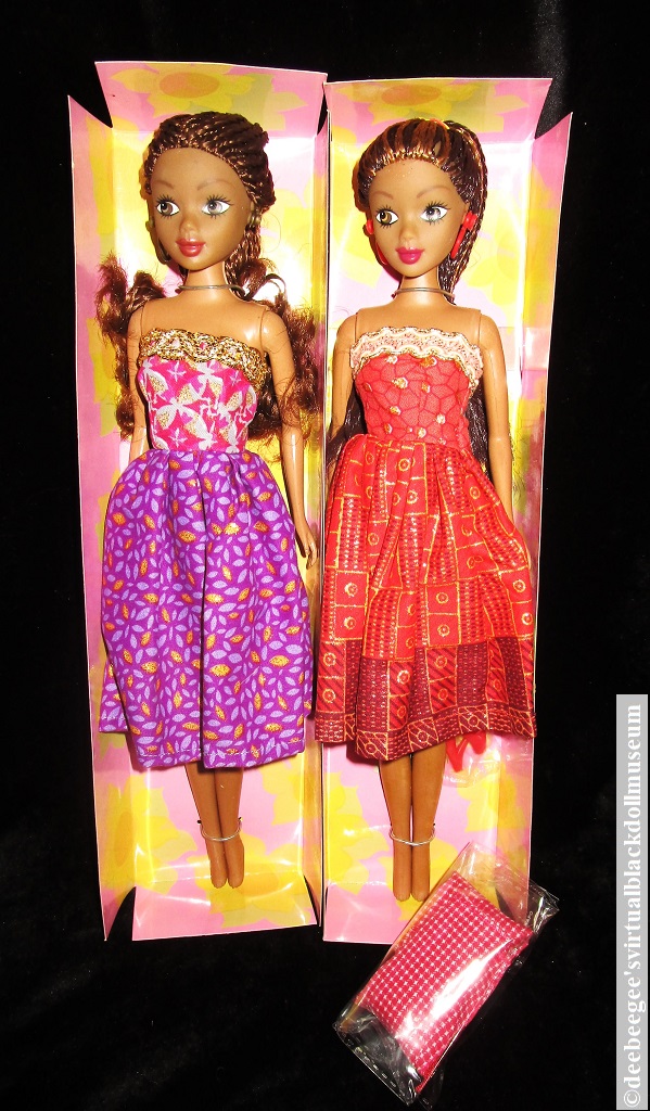 Clothes: Chinyere wears a traditional red and gold African print dress and red plastic hoop earrings; has an extra red halter top, a red and white gingham skirt, a matching headwrap, and separately packaged red high heels. Temilola wears a purple African print dress with gold plastic hoop earrings and has a pair of black high heels attached to the box liner. Aisha wears a traditional orange and yellow African print dress, and yellow earrings, and has a separately packaged pair of yellow pumps. Also separately packaged is Aisha’s yellow and white gingham wrap skirt with a matching head wrap, and a white star-print blouse as worn by the doll illustrated on the back and side panel of the box (see gallery photos).