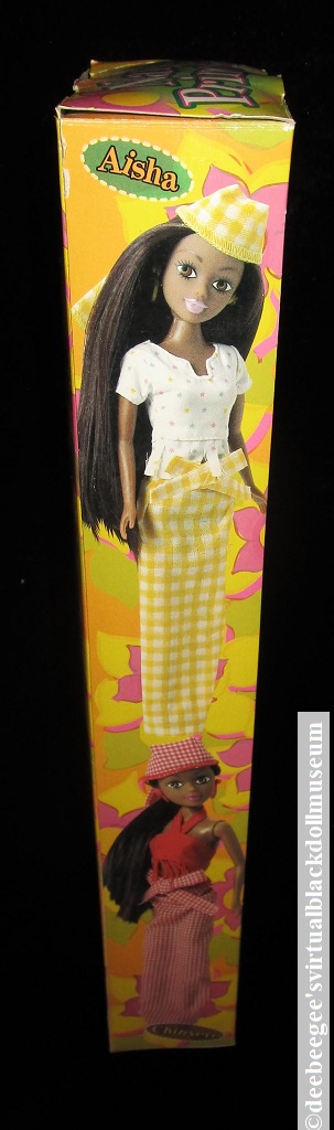 Clothes: Chinyere wears a traditional red and gold African print dress and red plastic hoop earrings; has an extra red halter top, a red and white gingham skirt, a matching headwrap, and separately packaged red high heels. Temilola wears a purple African print dress with gold plastic hoop earrings and has a pair of black high heels attached to the box liner. Aisha wears a traditional orange and yellow African print dress, and yellow earrings, and has a separately packaged pair of yellow pumps. Also separately packaged is Aisha’s yellow and white gingham wrap skirt with a matching head wrap, and a white star-print blouse as worn by the doll illustrated on the back and side panel of the box (see gallery photos).