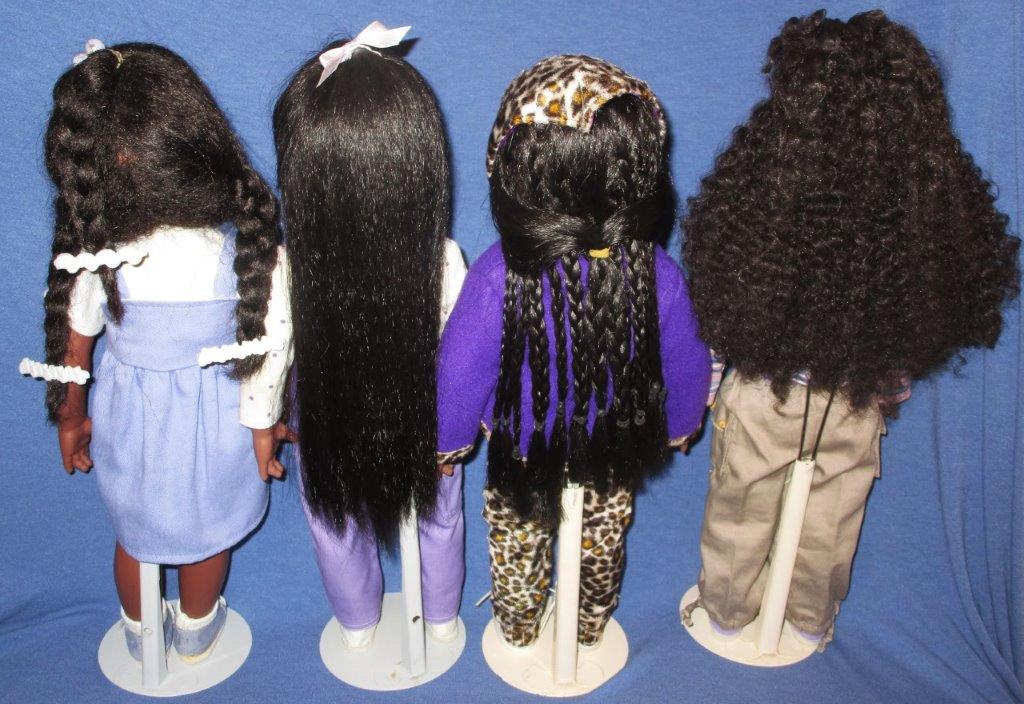 Hair, Eyes, and Mouths: Dolls 1-3 have dark brown Kanekalon wigs. (Doll 1’s hair is restyled in three braids; it was originally styled like Doll #2). Doll 1’s hair is coarser than the other wigged dolls’ hair. Doll #3 has microbraids with half of the top pulled back; Doll 3 is the only doll without bangs. Doll 4 has dark brown rooted curly hair. Each doll has brown stationary eyes and painted lower eyelashes. Their mouths are closed.