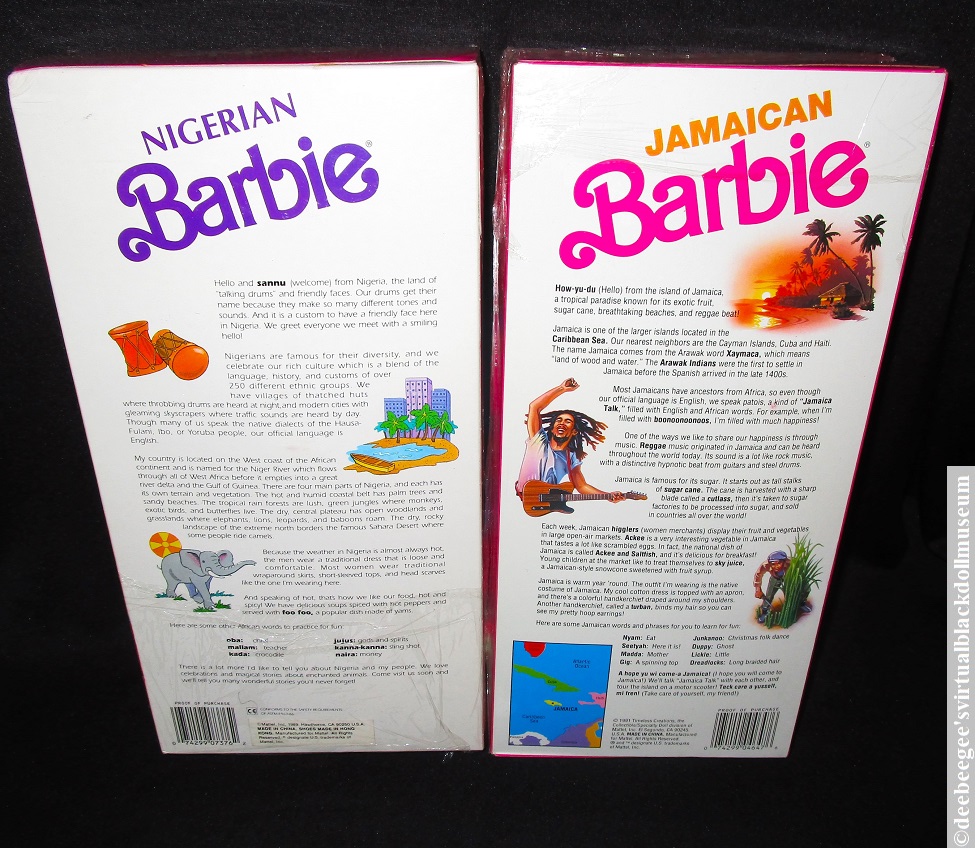 Head Sculpts: Nigerian, Jamaican, and Moroccan Barbie use the 1980s-1990s Christie sculpt. Kenyan Barbie uses the Nichelle head sculpt. Ghanian Barbie uses the Shani head sculpt. Princess of South Africa uses the Mbili head sculpt.