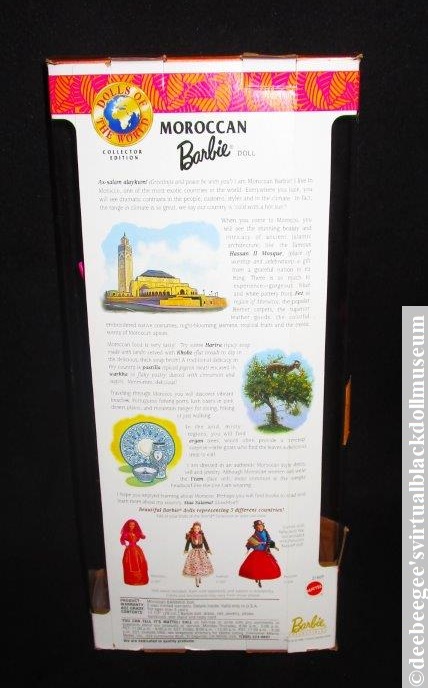 Other: From the Dolls of the World Collection, the back of each doll’s box provides pertinent information about each represented country. The Moroccan Barbie has the lightest complexion when compared to the others.