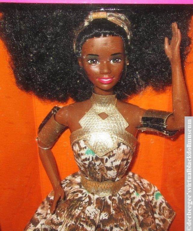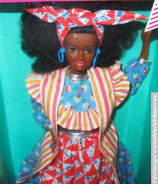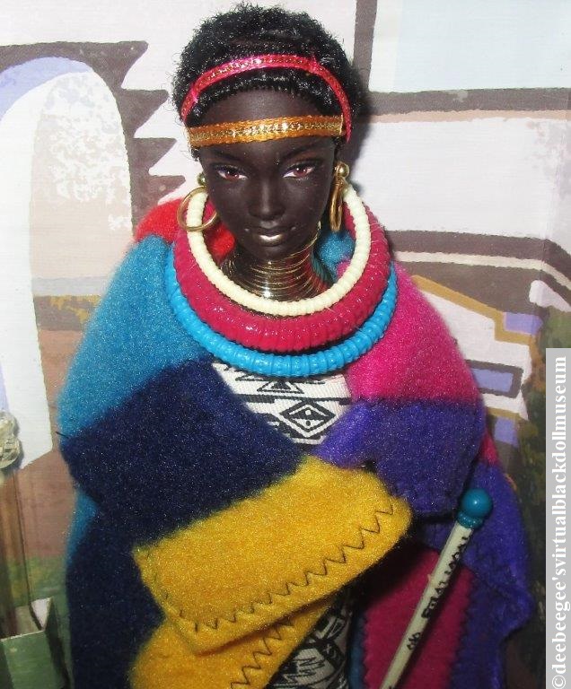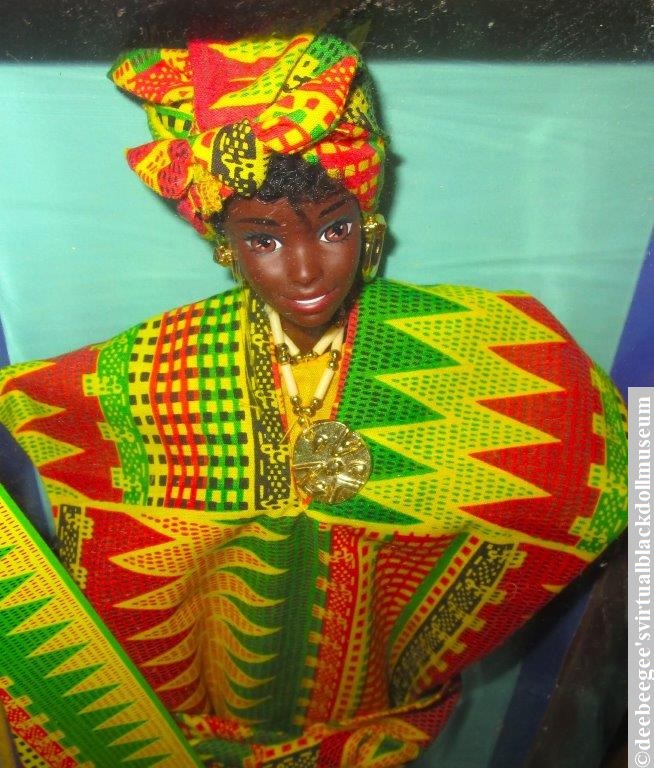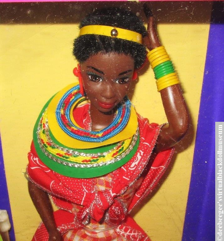 Hair, Eyes, Mouth: The brunette or black hair is rooted; Nigerian (huge curly Afro with fabric headband), Jamaican (shoulder-length curly hair with fabric headband), Moroccan (long straight with an attached veil). Kenyan (yellow headband), Ghanian (African-print headwrap), and Princess of South Africa (gold and red headbands); these three wear short hairstyles. All dolls have light-to-dark-brown-painted eyes. Nigerian, Jamaican, Ghanian, and Moroccan have painted teeth; Kenyan, and Princess of South Africa have closed mouths.