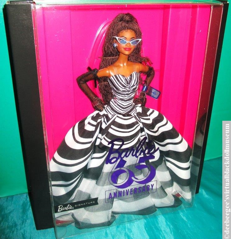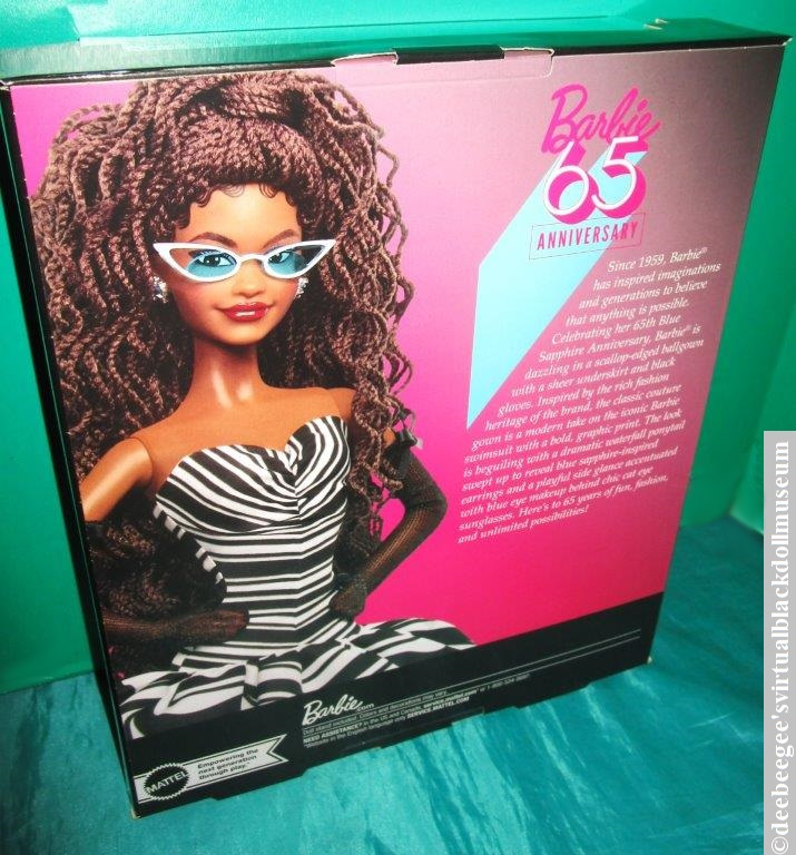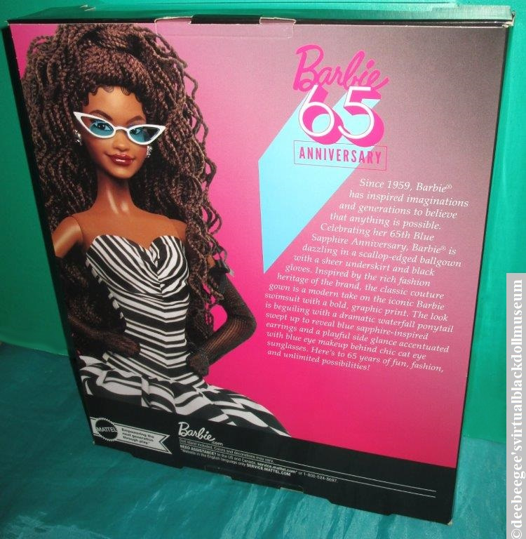 Other: Barbie Signature 65th Blue Sapphire Anniversary Barbie celebrates #1 Barbie’s 65th anniversary. From March 5, 2024, at 9:00 PM PT through March 6, 2024, at 8:59 PM PT, only Barbie Signature members could buy the Barbie 65th Anniversary doll at MattelCreations.com after which time purchasing was open to the public. The package includes a certificate of authenticity. The doll’s sapphire earrings pay tribute to Barbie’s 65 years of longevity. A full description of the doll is on the back of the box with the ending statement, “Here’s to 65 years of fun, fashion, and unlimited possibilities.”