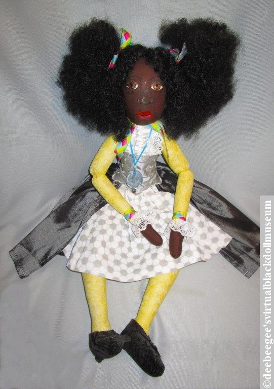 Clothes: Simone has arms and legs of yellow fabric and wears a multicolored fabric dress with an attached sateen gray overskirt with black fabric shoes, and a ribbon necklace with a Lucite pendant.