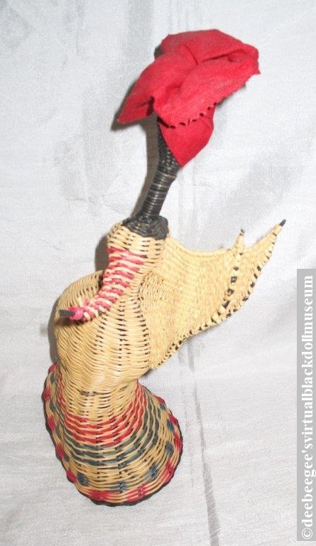 Clothes: The doll’s dress is formed of woven natural-colored wicker with red and blue wicker at the hemline and red woven wicker sleeves. Natural colored raffia creates the wings.