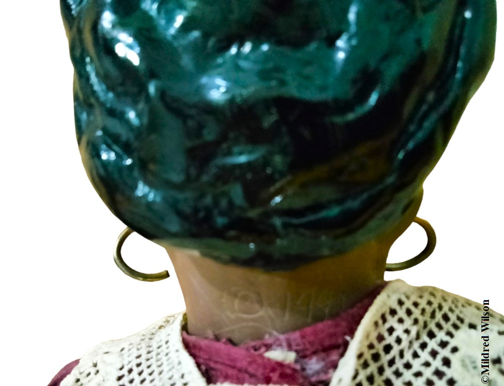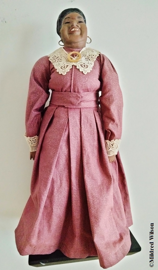 Other: Mary E. Washington’s original dolls were made in ultra-limited editions to honor historical figures and the trends and customs of ordinary people. Gold-capped front teeth (full crowns or open-face crowns) became popular during the Jim Crow era among African Americans who viewed gold teeth as status symbols. However, gold teeth ornamentation is “an ancient practice which dates back as far as 4,000 years… in Southeast Asia (Gold Teeth). In this hand-sculpted, original full-figured doll with broad facial features, Ms. Washington captured this African American trend (which in today’s hip-hop culture is often displayed as full gold “grills”).
