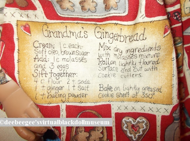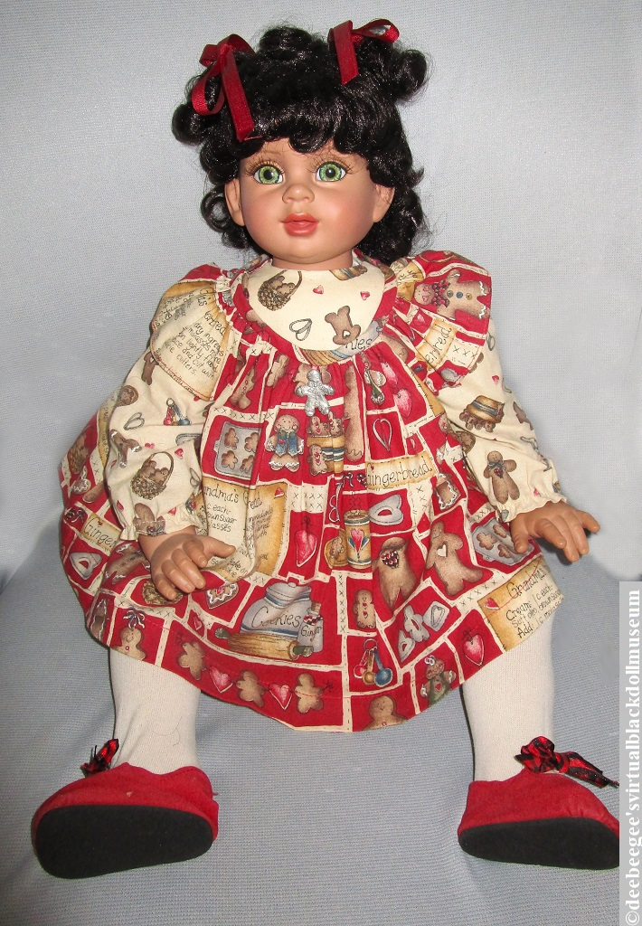 Clothes: Ginger wears a pinafore dress made from a Gingerbread man cookie print that has a recipe for “Grandma’s Gingerbread” printed on the dress. Ginger also wears matching hair bows, white pantaloons, white tights, and dark red faux suede Mary Jane shoes with black and red check bow accents.