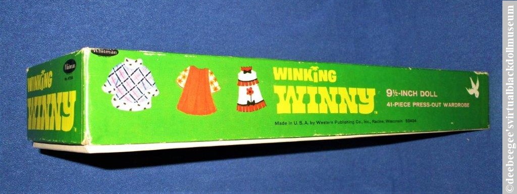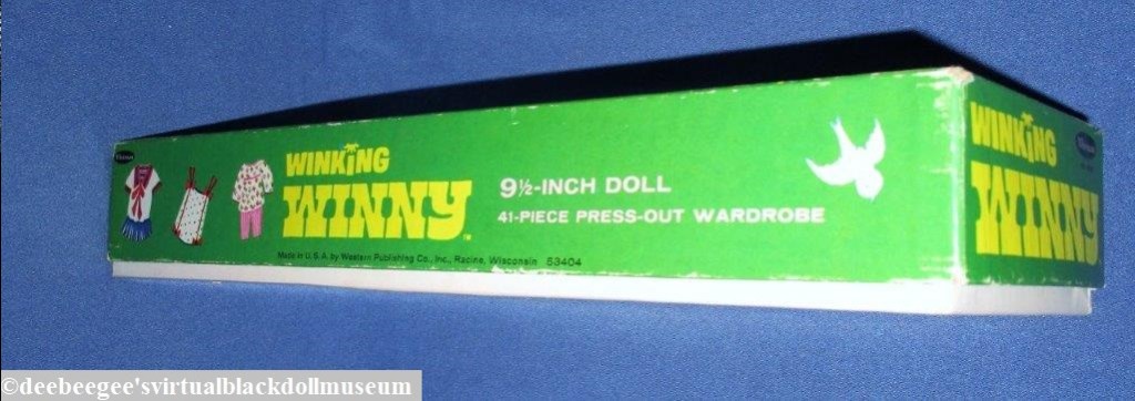 Description: Winking Winny boxed paper doll set includes the cardboard paper doll, a 41-piece punch-out wardrobe, and a plastic stand. Six of the fashions are illustrated on the side box panels, with three illustrations on both sides.