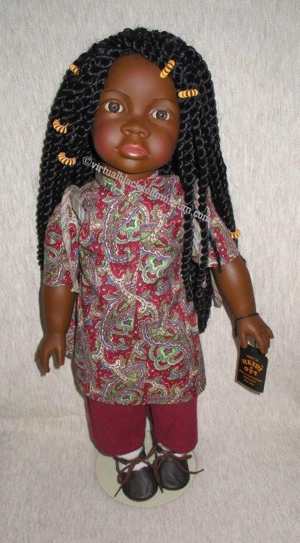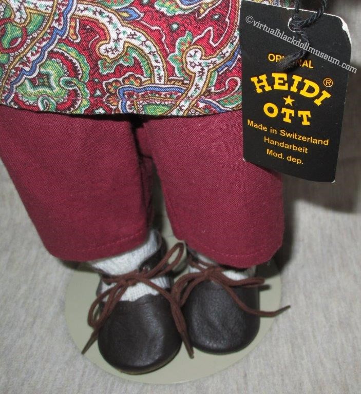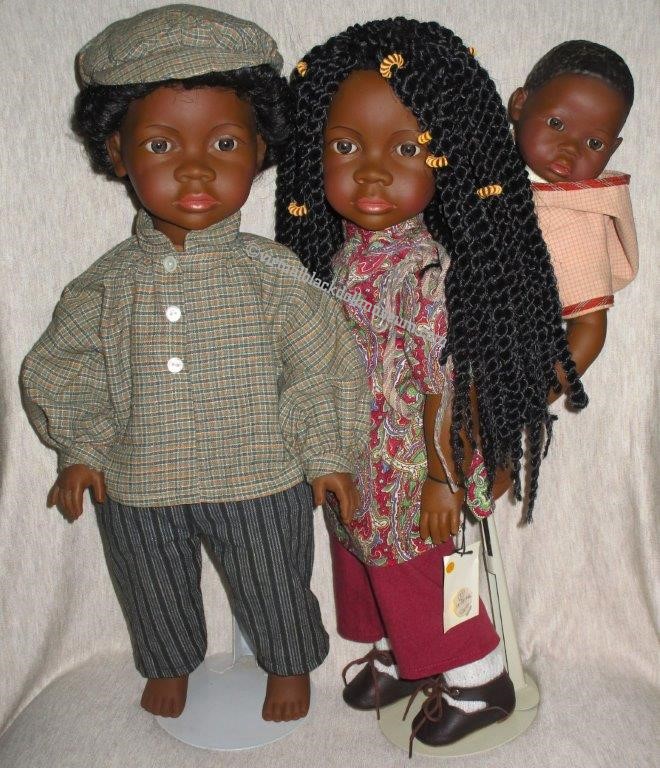 Other: Made in Switzerland, this doll trio represents African children with ethnically correct facial features. All dolls have Heidi Ott hang tags and certificates of authenticity. A second identical baby (not shown) appears in the Heidi Ott 1988 catalog along with the boy, girl, and baby featured in this installation. In the catalog, the dolls’ names are not revealed by Ott, who explained, “Naturally, all my dolls have their own names, but unfortunately, they have to remain a secret. The reason being is that many firms in countries all around the world have registered almost all [childrens’] names in existence, therefore I wish to avoid any legal action involving copyright.” In later years, Ott revealed her dolls’ names.