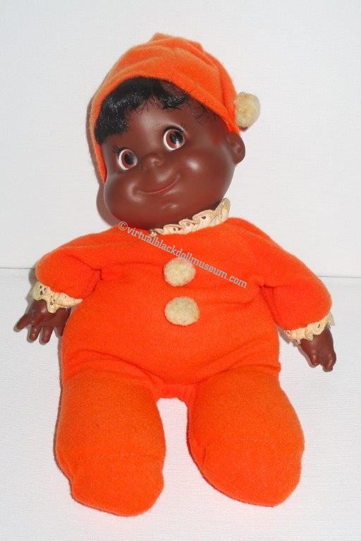 Hair, Eyes, Mouth: Sculpted hair underneath an orange fleece nightcap and black synthetic bangs, brown-painted eyes and black eyelashes in the outer-upper corners of the eyes; closed, wide-smiling mouth