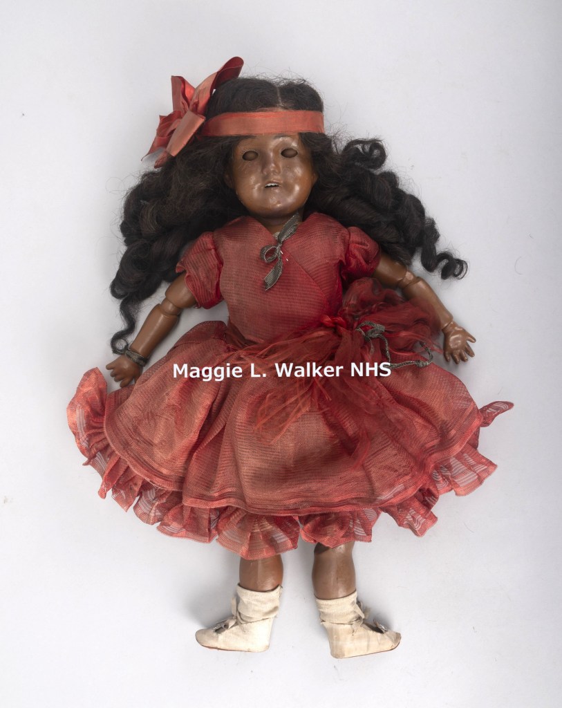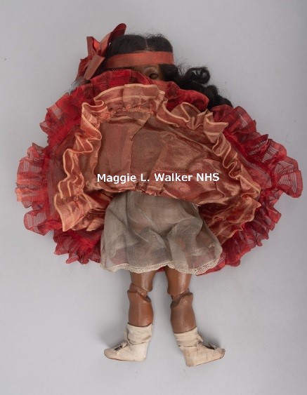 The lovely example of an authentic Berry & Ross doll in this installation is part of the Maggie L. Walker National Historic Site’s Museum Collection. It is presumed the doll was owned by one or all of Mrs. Walker’s grandchildren, who were born between 1918 and 1924. This doll was included in a temporary exhibit at the national historic site in honor of Maggie L. Walker’s 160th birthday.