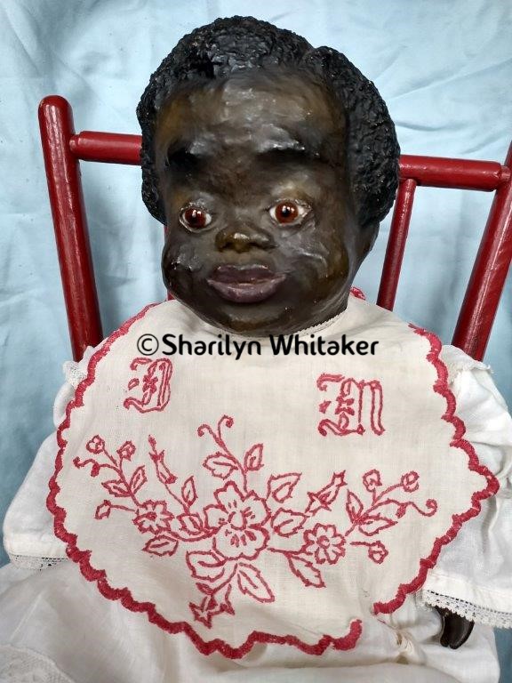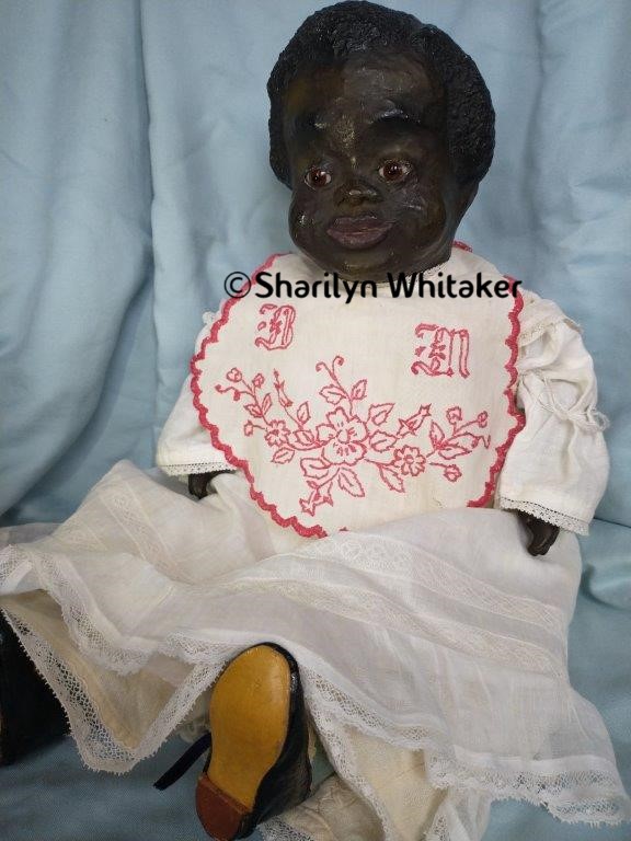 The current owner purchased this fine example of an original Leo Moss doll from a sales room dealer at the 75th Annual UFDC Convention in Kansas City, MO. A very similar (if not the same) one-of-a-kind, hand-sculpted doll by Leo Moss, circa 1900, is featured on page 33 of Black Dolls Book II an Identification and Value Guide by Myla Perkins (Collectors Books, 1995).