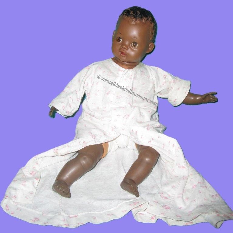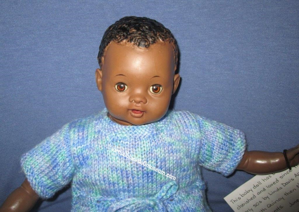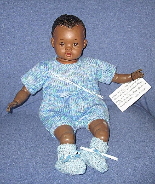Other: This rarely found brother of Ideal’s Saralee Negro Doll arrived dressed in an infant’s layette gown and an infant-sized pinned-on cloth diaper with a handwritten attached tag that states, “This baby doll has been cherished and loved since the early 50s by Linda Davis Allen of North Quincy, then Newbury, Massachusetts. June 4, 2025.” Thanks to Ms. Allen and her daughter, the doll is now owned by DeeBeeGee’s Virtual Black Doll Museum. It completes the known anthropologically correct doll members of the Saralee Negro Doll family—Saralee, Saralee’s all-vinyl toddler sister, and Saralee’s baby brother—designed by Sara Lee Creech. Other family members were planned and sculpted by Sheila Burlingame, but the three aforementioned, including this baby brother, are the only known dolls produced.