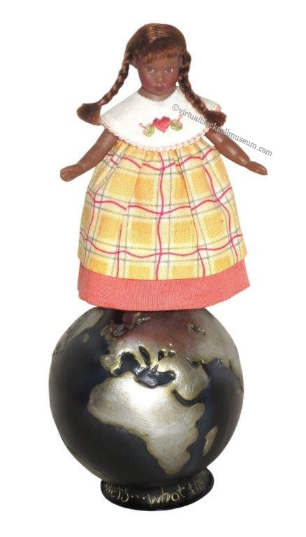 Other: Helen Kish’s line of Kishlets are 4-1/2-inch resin dolls dressed in Boneka clothing. The original Evie was presented in a transparent cylinder. Evie on Top of the World was a 2004 International Doll Exposition (IDEX) exclusive produced in a limited edition of 100 dolls worldwide. A peg on top of the resin globe inserts into a hole underneath the doll’s right shoe. “IDEX, a trade show dedicated to the celebration of dolls, teddy bears, toys and collectible playthings, ran without interruption for twenty-two years” (IDEX). The last show was in 2013.