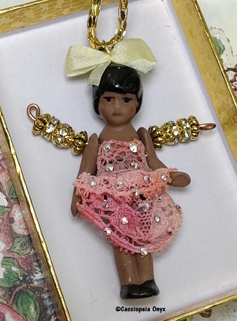 Material: Porcelain, vintage lace, Swarovski crystals, gold-tone beads and chains, ribbon, glue