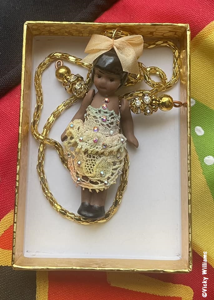 Other: In 2024, the WLBDA group commissioned doll artist Goldie Wilson to design 21 exclusive doll necklaces using an antique-style porcelain doll. Each necklace is a one-of-a-kind, handmade piece. The group administrator included a note with each necklace that indicates the necklaces were created by Goldie Wilson in 2024 as the 2025 WLBDA Club Doll. Six of the 21 necklaces are featured in this installation courtesy of club members Phyllis B. Burns, Julia Bush, Debbie Behan Garrett, Nini McOrmsby, Cassiopeia Onyx, and Vicky Williams.