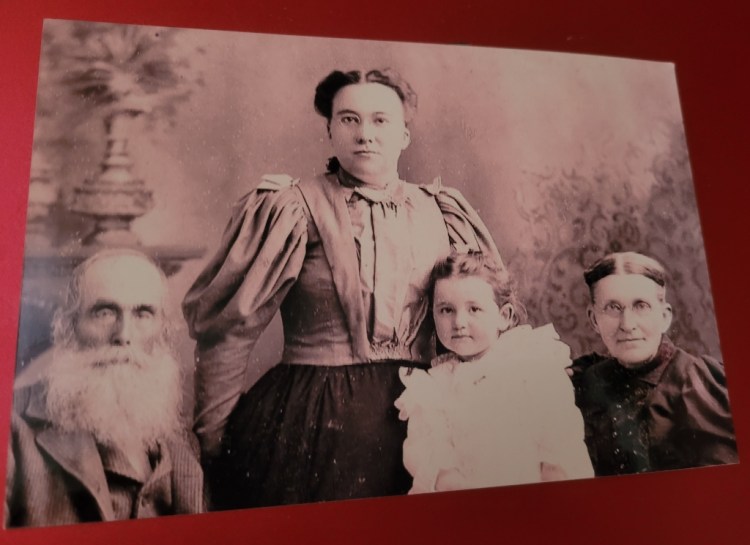 L-R: In a circa 1913 photograph are early Detroit pioneers Joseph William Emhuff, Martha Jach Emhuff (Mildred’s mother, standing), young Mildred Emhuff, and Joseph’s wife, Mathilda (Mildred’s grandmother). Young Mildred is a former owner of the composition Horsman Mama doll in this installation.