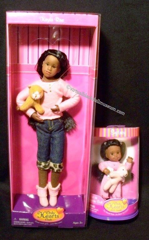 Other: Only Hearts Club dolls are soft-bodied and poseable with vinyl heads and life-like facial features. Briana Joy was introduced in 2005 with her dog, Longfellow, as part of the original six Only Hearts Club dolls. Several series of dolls followed. The deeper-complexioned Kayla Ray and Sydney were introduced and sold separately with their plush teddy bears in 2008. Sydney is Kayla Rae’s little sister. At least three versions of Kayla Rae exist, one of which was sold with Sydney in a big sister-little sister set. An assortment of separately-sold fashions were available for the 9-inch dolls. The 9-inch dolls use the same head sculpt.