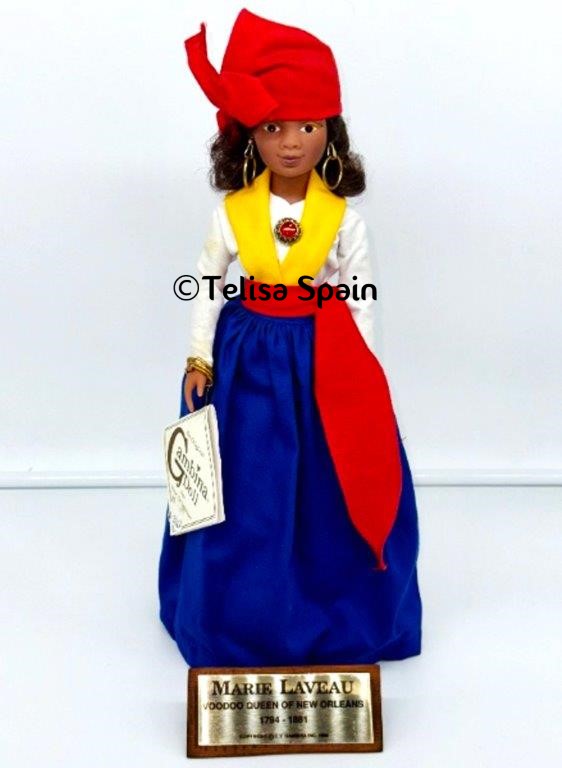“Marie Laveau died in her sleep in her house (that no longer stands) on St. Ann St. in 1881 at the age of 87. In her last years she renounced voodooism and was given a Catholic burial. She is buried in the St. Louis Cemetery #1. Many people today believe that Marie Laveau’s spirit still lurks about New Orleans practicing voodoo! © (The above text was copied from the doll’s hang tag booklet.)
