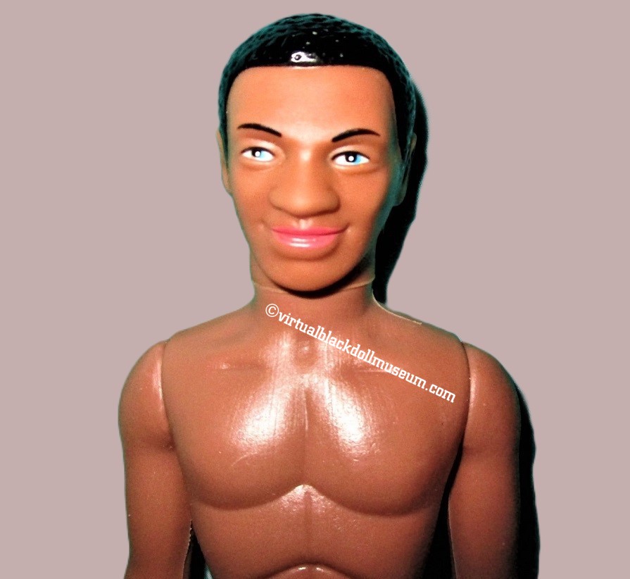 Hair, Eyes, Mouth: Straight-textured sculpted black hair with a sculpted side part, brown-painted eyes, open smile with painted teeth, and no lip color