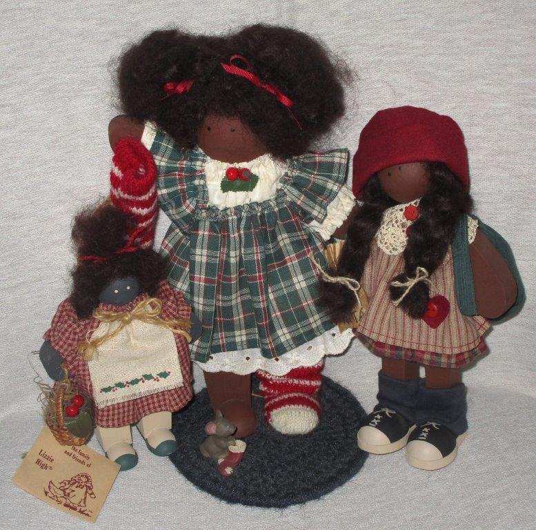 Ladie and Friends, Inc., Lizzie High dolls, L-R: Little Ones with Basket of Greens (1990), Nettie Brown 2nd Edition Christmas Doll (1996), and Bonita from the Punkin collection.