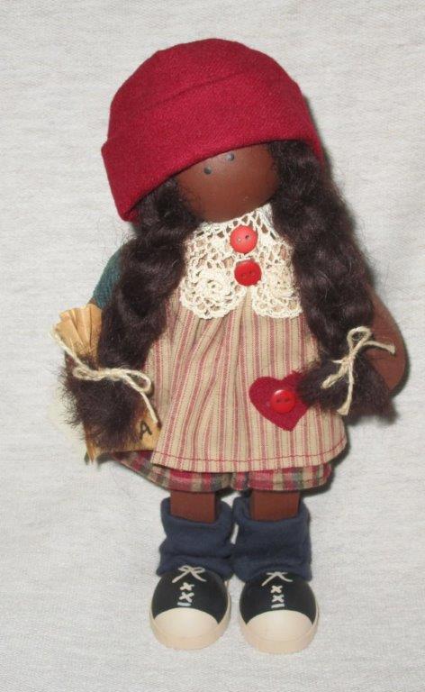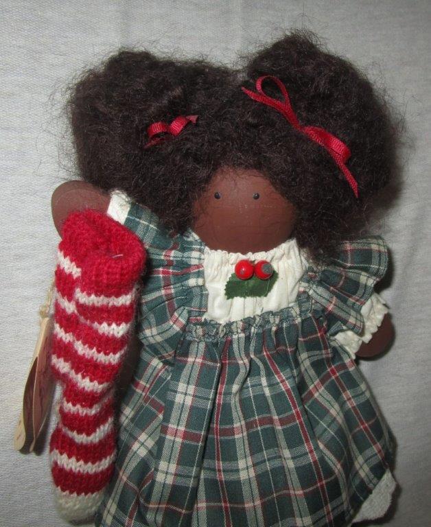 Nettie Brown™ is product #1114. The inside right of Nettie Brown’s hangtag reads, “The blank round face with two dots for eyes on the Lizzie High® doll is a trademark of Ladie & Friends, Inc.” The inside left of the hangtag reads, “Nettie always wears her striped stockings except on Christmas Eve when she hangs them on the mantle…hoping for goodies from Santa.” (On the back) This Lizzie High® doll was handcrafted for you by Barb and Karen/©Ladie and Friends, Inc, 1996.