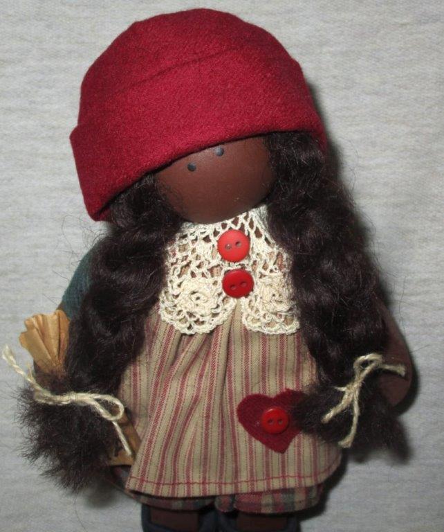 Hair, Eyes, Mouths: (Little Ones) brown topknot accented with red thread, ivory dots for eyes; (Nettie Brown) brown mohair styled in two side puffs adorned with a dark red ribbon, black dots for eyes; (Bonita) two brown mohair braids tied with natural string at the ends, black dots for eyes; Lizzie High dolls are mouthless.