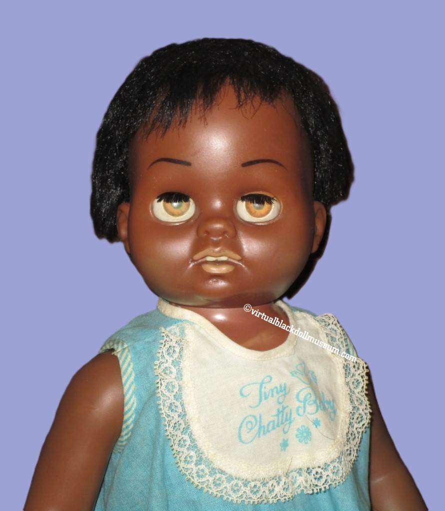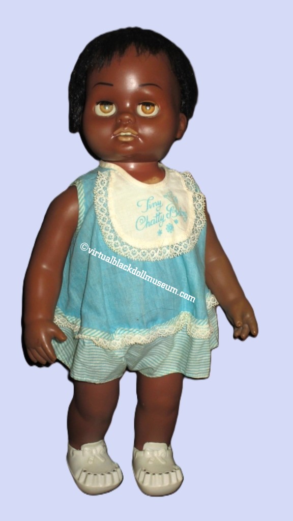 Other: Some of Tiny Chatty Baby’s phrases include, “Baby sleepy,” “I love you Mommie,” and “Hi Mama.” A Black version of Tiny Chatty Brother was never produced. Some collectors redress Black Tiny Chatty Baby dolls (a girl) in Tiny Chatty Brother’s clothing to create a Black version of the doll. See the Tiny Chatty dolls produced by Mattel here.